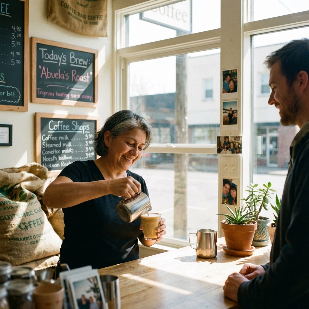 Now imagine they say: "Our founder started this place after spending three months with coffee farmers in Guatemala. She came back with their family recipes and a promise to pay them three times the fair trade rate. Every cup you drink helps send their kids to school."